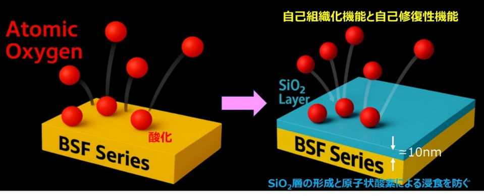 また、LEOには大気中の酸素分⼦が太陽からの紫外線を受けて分解されることにより原子状酸素(AO)が発生しています。AOは衛星の外表面の部材に酸化を引き起こし、性能劣化や寿命短縮の要因になります。BSF-30はAOに耐性があるシロキサン変性ポリイミド樹脂であり、LEOに展開されたD-SAILの膜面に二酸化珪素(SiO₂)被膜を形成し、AOによる膜面の劣化を防ぎます。