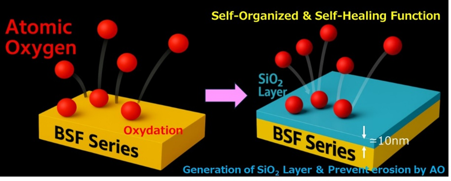 In addition, AO is produced in LEO when oxygen molecules in the atmosphere are decomposed by the Sun’s ultraviolet rays. AO causes oxidation of the satellite’s surface materials, leading to performance degradation and shortened lifespan. BSF-30 is an AO-resistant Siloxane-modified polyimide resin which forms a Silicon Dioxide (SiO₂) coating on the membrane to mitigate AO deterioration after D-SAIL’s deployment in LEO.